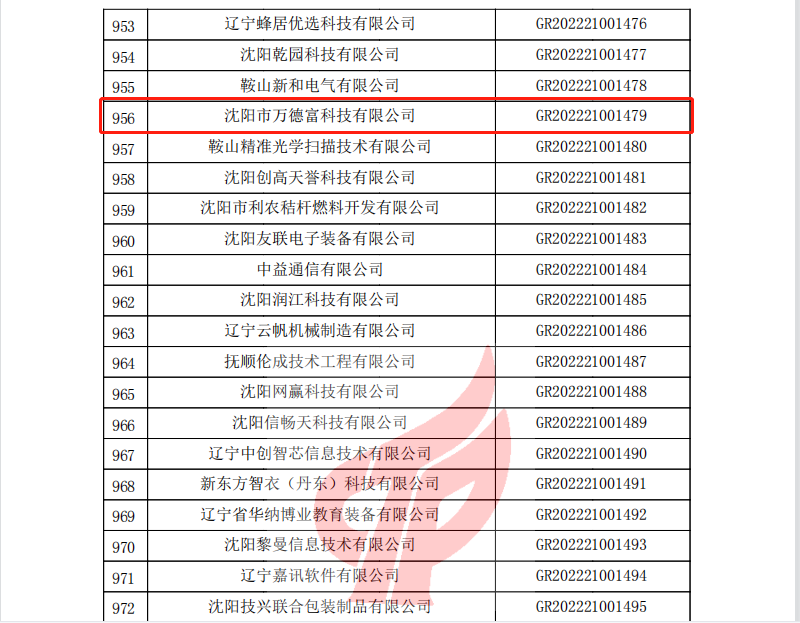 2022年12月26日,全國高新技術(shù)企業(yè)認(rèn)定管理工作領(lǐng)導(dǎo)小組辦公室正式發(fā)函,公布了遼寧省2022年認(rèn)定的第二批高新技術(shù)企業(yè)備案名單。沈陽市萬德富科技有限公司成功通過國家高新技術(shù)企業(yè)認(rèn)定。